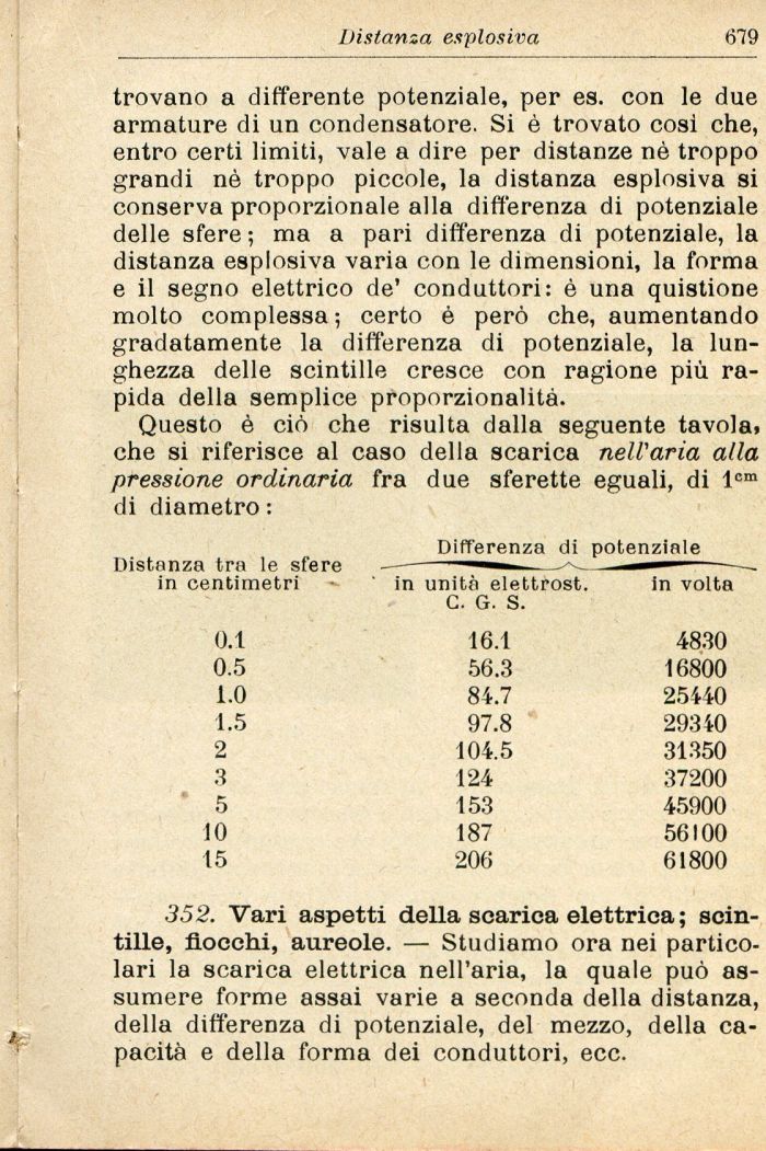 trovano a differente potenziale, per es. con le due armature di un condensatore. Si è trovato così che, entro certi limiti, vale a dire per distanze nè troppo grandi nè troppo piccole, la distanza esplosiva si conserva proporzionale alla differenza di potenziale delle sfere; ma a pari differenza di potenziale, la distanza esplosiva varia con le dimensioni, la forma e il segno elettrico de' conduttori: è una quistione molto complessa; certo è però che, aumentando gradatamente la differenza di potenziale, la lunghezza delle scintille cresce con ragione più rapida della semplice proporzionalità.