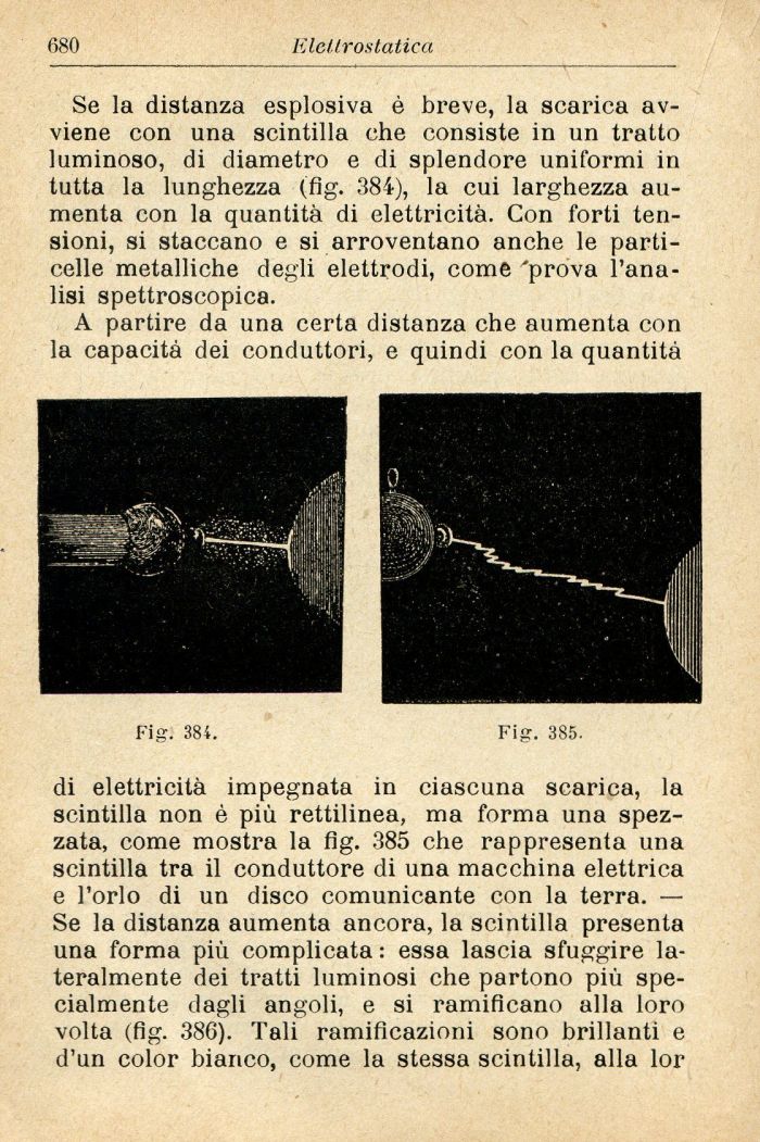 Se la distanza esplosiva è breve, la scarica avviene con una scintilla che consiste in un tratto luminoso, di diametro e di splendore uniformi in tutta la lunghezza (fig. 384), la cui larghezza aumenta con la quantità di elettricità. Con forti tensioni, si staccano e si arroventano anche le particelle metalliche degli elettrodi, come 'prova l'analisi spettroscopica.