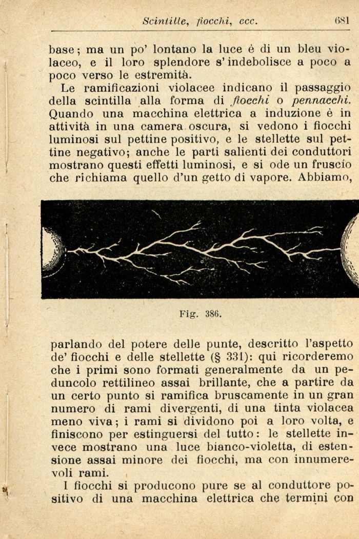 Le ramificazioni violacee indicano il passaggio della scintilla alla forma di fiocchi o pennacchi. Quando una macchina elettrica a induzione č in attivitā in una camera oscura, si vedono i fiocchi luminosi sul pettine positivo, e le stellette sul pettine negativo; anche le parti salienti dei conduttori mostrano questi effetti luminosi, e si ode un fruscio che richiama quello d'un getto di vapore. Abbiamo,
