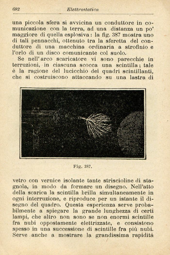 una piccola sfera si avvicina un conduttore in comunicazione con la terra, ad una distanza un po' maggiore di quella esplosiva : la fig. 387 mostra uno di tali pennacchi, ottenuto tra la sferetta del conduttore di una macchina ordinaria a strofinio e l'orlo di un disco comunicante col suolo.