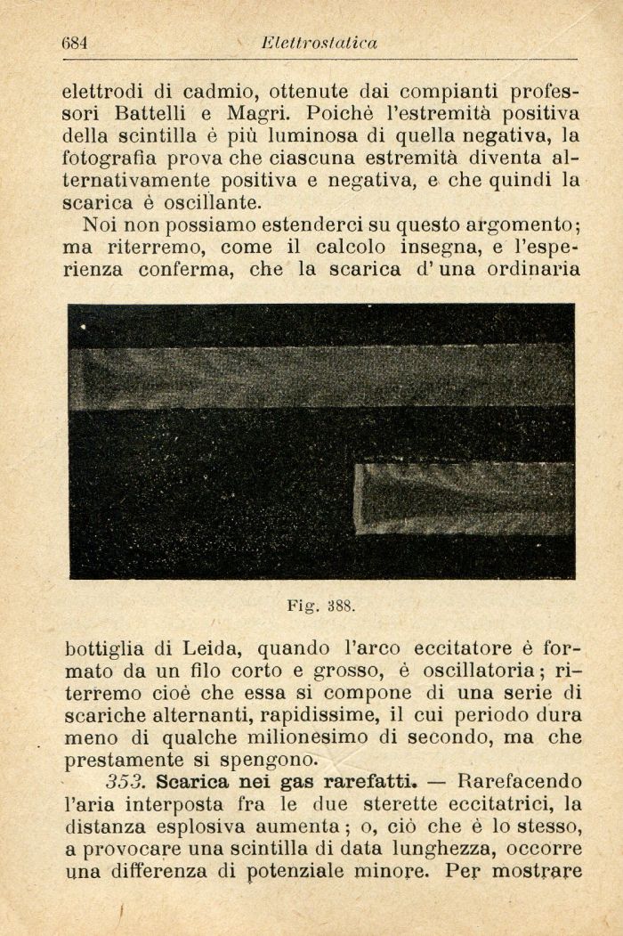 elettrodi di cadmio, ottenute dai compianti professori Battelli e Magri. Poiché l'estremità positiva della scintilla è più luminosa di quella negativa, la fotografìa prova che ciascuna estremità diventa alternativamente positiva e negativa, e che quindi la scarica è oscillante.