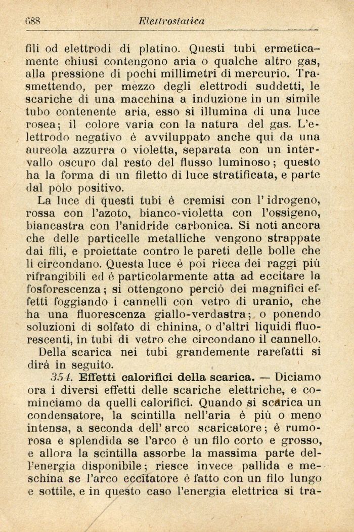 La luce di questi tubi è cremisi con l'idrogeno, rossa con l'azoto, bianco-violetta con l'ossigeno, biancastra con l'anidride carbonica. Si noti ancora che delle particelle metalliche vengono strappate dai fili, e proiettate contro le pareti delle bolle che li circondano. Questa luce è poi ricca dei raggi più rifrangibili ed è particolarmente atta ad eccitare la fosforescenza ; si ottengono perciò dei magnifici effetti foggiando i cannelli con vetro di uranio, che ha una fluorescenza giallo-verdastra; o ponendo soluzioni di solfato di chinina, o d'altri liquidi fluorescenti, in tubi di vetro che circondano il cannello.