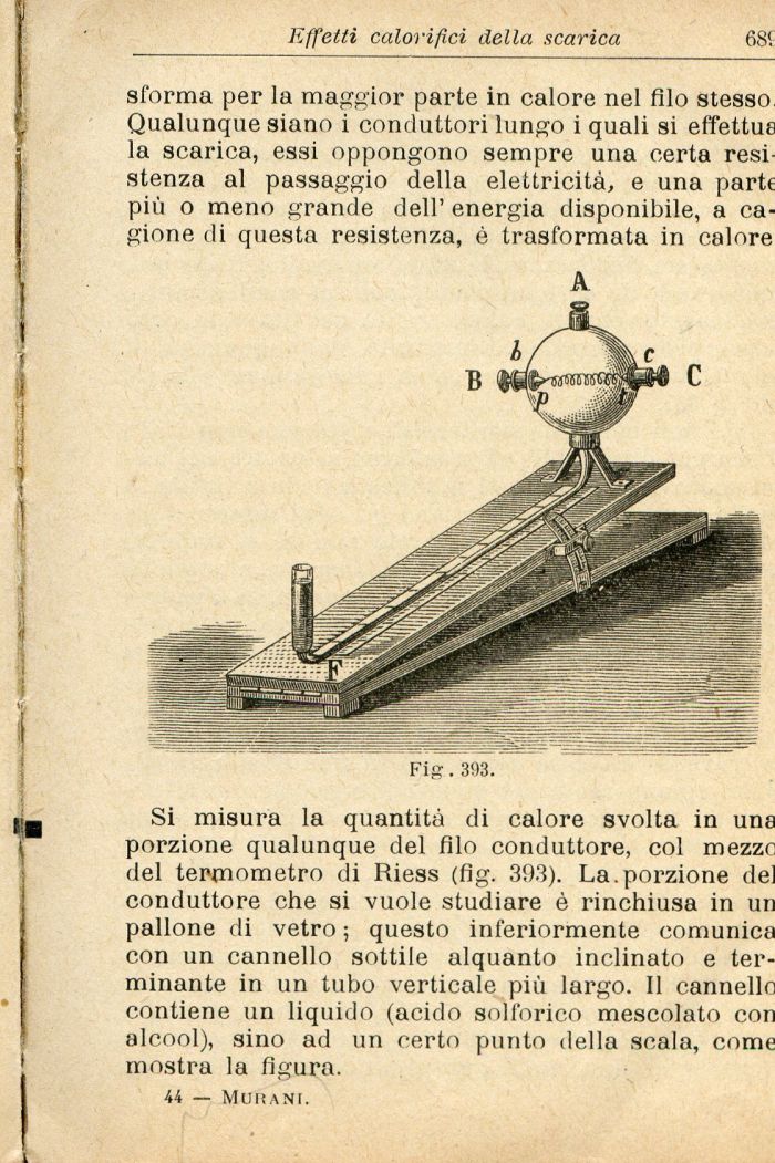 Si misura la quantità di calore svolta in una porzione qualunque del filo conduttore, col mezze del termometro di Riess (fig. 393). La.porzione del conduttore che si vuole studiare è rinchiusa in un pallone di vetro ; questo inferiormente comunica con un cannello sottile alquanto inclinato e terminante in un tubo verticale più largo. Il cannello contiene un liquido (acido solforico mescolato con alcool), sino ad un certo punto della scala, come mostra la figura.