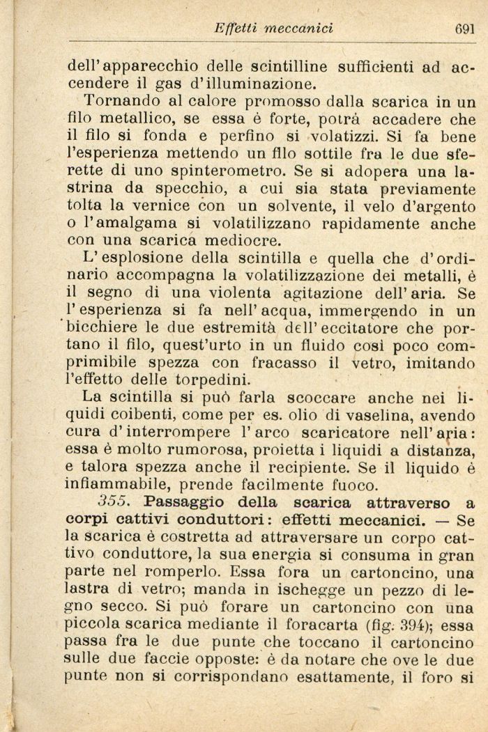 Tornando al calore promosso dalla scarica in un filo metallico, se essa è forte, potrà accadere che il filo si fonda e perfino si volatizzi. Si fa bene l'esperienza mettendo un filo sottile fra le due sferette di uno spinterometro. Se si adopera una lastrina da specchio, a cui sia stata previamente tolta la vernice con un solvente, il velo d'argento o l'amalgama si volatilizzano rapidamente anche con una scarica mediocre.