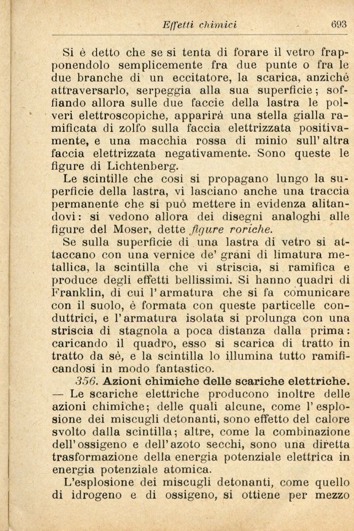 356. Azioni chimiche delle scariche elettriche. — Le scariche elettriche producono inoltre delle azioni chimiche; delle quali alcune, come l'esplosione dei miscugli detonanti, sono effetto del calore svolto dalla scintilla; altre, come la combinazione dell'ossigeno e dell'azoto secchi, sono una diretta trasformazione della energia potenziale elettrica in energia potenziale atomica.
