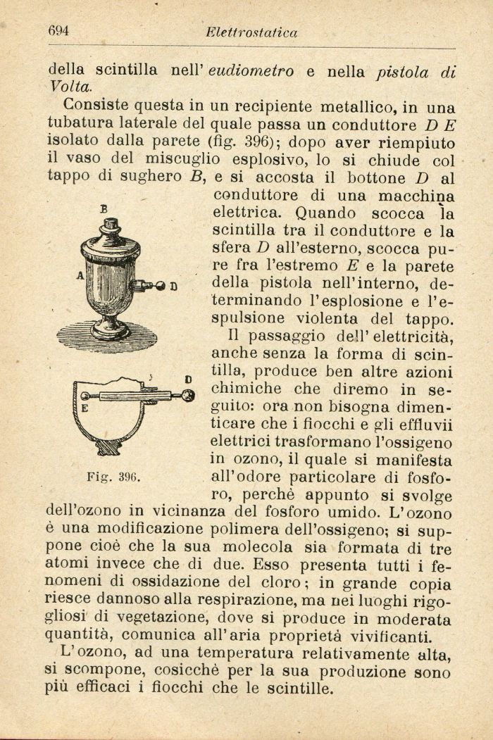 Consiste questa in un recipiente metallico, in una tubatura laterale del quale passa un conduttore D E isolato dalla parete (fig. 396); dopo aver riempiuto il vaso del miscuglio esplosivo, lo si chiude col tappo di sughero B, e si accosta il bottone D al conduttore di una macchina elettrica. Quando scocca la scintilla tra il conduttore e la sfera D all'esterno, scocca pure fra l'estremo E e la parete della pistola nell'interno, determinando l'esplosione e l'espulsione violenta del tappo.
