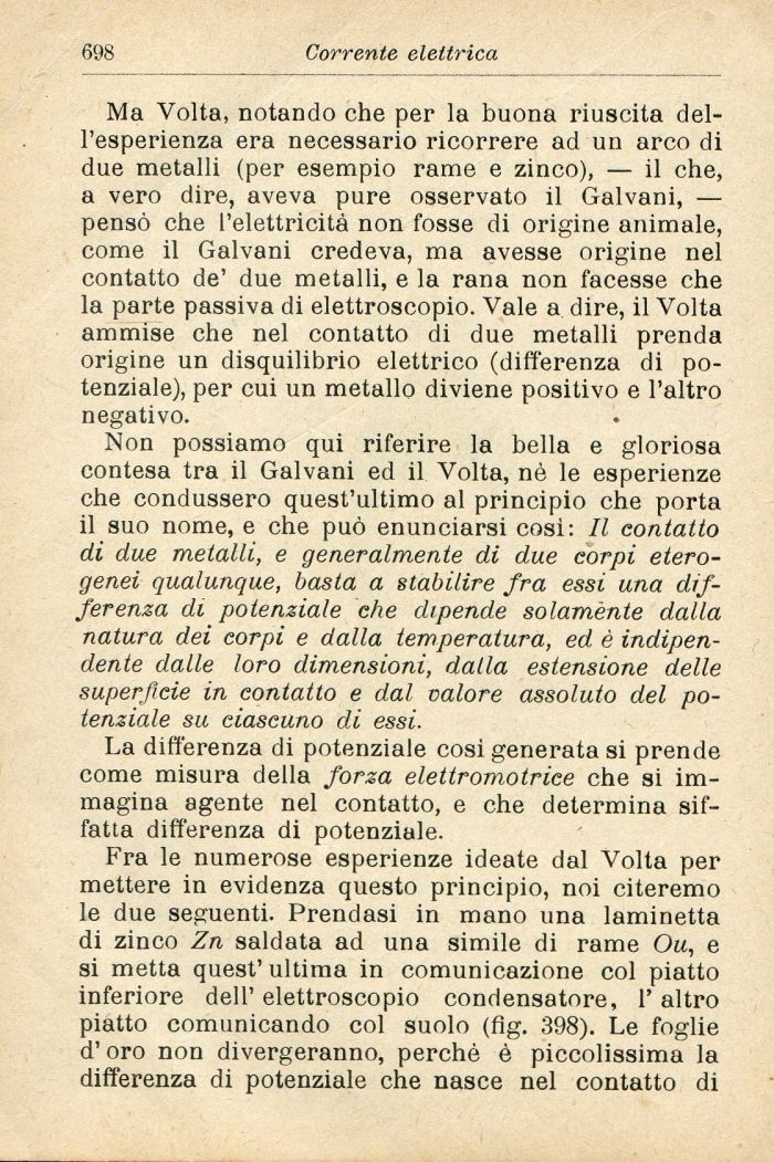 Ma Volta, notando che per la buona riuscita dell'esperienza era necessario ricorrere ad un arco di due metalli (per esempio rame e zinco), — il che, a vero dire, aveva pure osservato il Galvani, — pensò che l'elettricità non fosse di origine animale, come il Galvani credeva, ma avesse origine nel contatto de' due metalli, e la rana non facesse che la parte passiva di elettroscopio. Vale a dire, il Volta ammise che nel contatto di due metalli prenda origine un disquilibrio elettrico (differenza di potenziale), per cui un metallo diviene positivo e l'altro negativo.