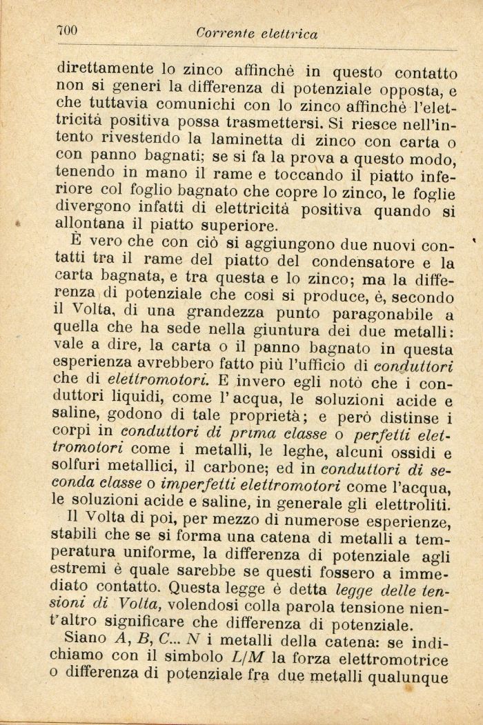 È vero che con ciò si aggiungono due nuovi contatti tra il rame del piatto del condensatore e la carta bagnata, e tra questa e lo zinco; ma la differenza di potenziale che cosi si produce, è, secondo il Volta, di una grandezza punto paragonabile a quella che ha sede nella giuntura dei due metalli: vale a dire, la carta o il panno bagnato in questa esperienza avrebbero fatto più l'ufficio di conduttori che di elettromotori. E invero egli notò che i conduttori liquidi, come 1' acqua, le soluzioni acide e saline, godono di tale proprietà; e però distinse i corpi in conduttori di prima classe o perfetti elettromotori come i metalli, le leghe, alcuni ossidi e solfuri metallici, il carbone; ed in conduttori di seconda classe o imperfetti elettromotori come l'acqua, le soluzioni acide e saline, in generale gli elettroliti.