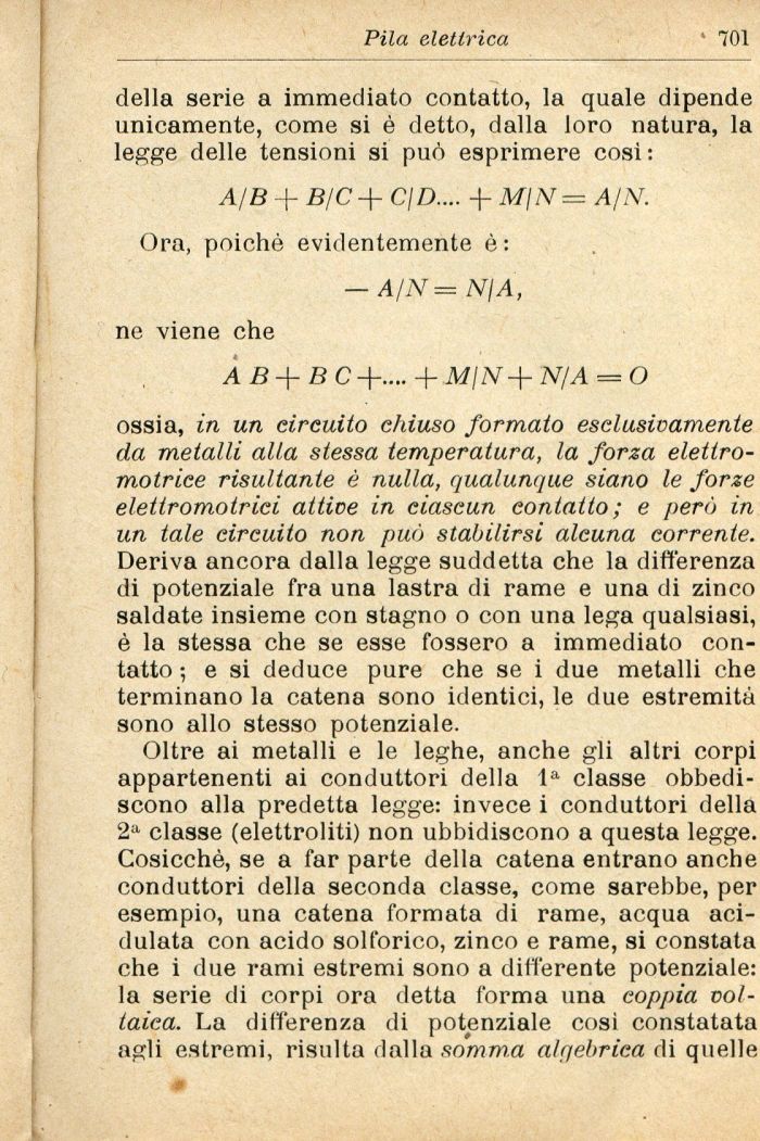 Oltre ai metalli e le leghe, anche gli altri corpi appartenenti ai conduttori della la classe obbediscono alla predetta legge: invece i conduttori della 2a classe (elettroliti) non ubbidiscono a questa legge. Cosicché, se a far parte della catena entrano anche conduttori della seconda classe, come sarebbe, per esempio, una catena formata di rame, acqua aci-dulata con acido solforico, zinco e rame, si constata che i due rami estremi sono a differente potenziale: la serie di corpi ora detta forma una coppia voltaica. La differenza di potenziale cosi constatata agli estremi, risulta dalla somma algebrica di quelle