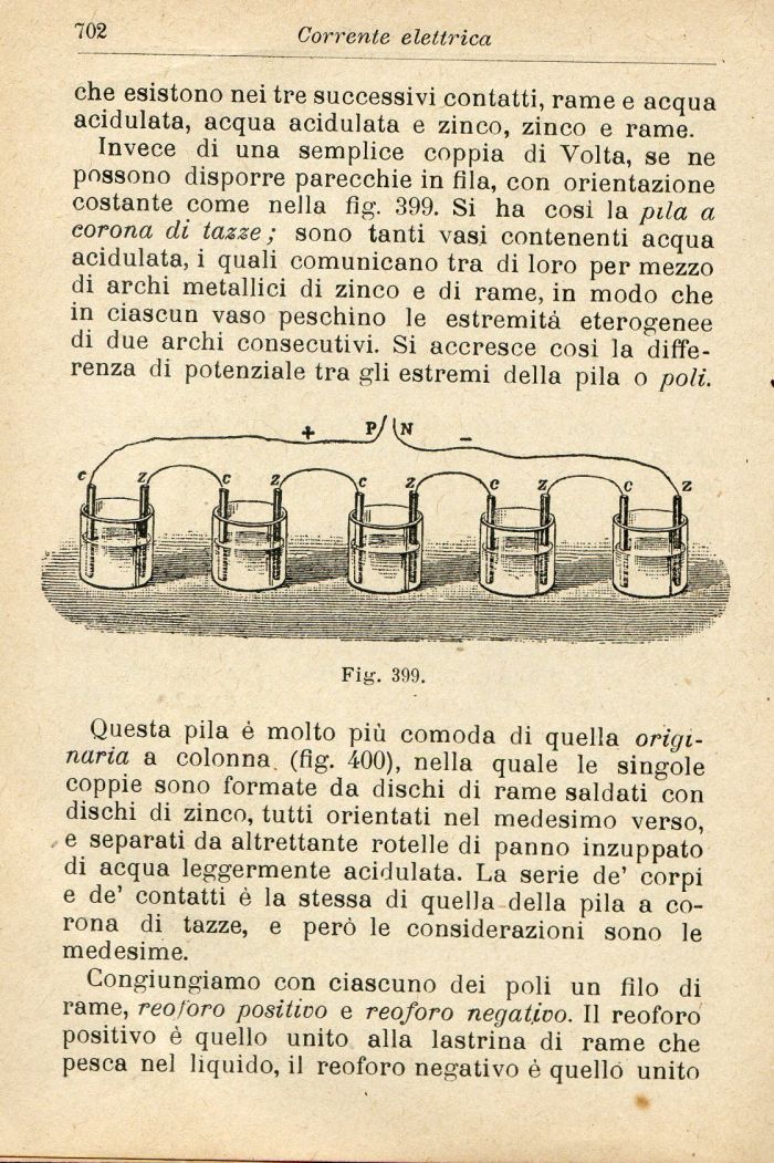 Invece di una semplice coppia di Volta, se ne possono disporre parecchie in fila, con orientazione costante come nella fig. 399. Si ha cosi la pila a corona di tazze ; sono tanti vasi contenenti acqua acidulata, i quali comunicano tra di loro per mezzo di archi metallici di zinco e di rame, in modo che in ciascun vaso peschino le estremità eterogenee di due archi consecutivi. Si accresce così la differenza di potenziale tra gli estremi della pila o poli.