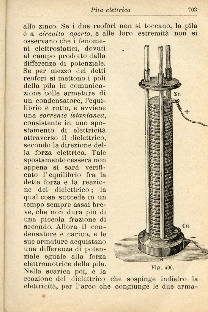 allo zinco. Se i due reofori non si toccano, la pila è a circuito aperto, e alle loro estremità non si osservano che i fenomeni elettrostatici, dovuti al campo prodotto dalla differenza di potenziale. Se per mezzo dei detti reofori si mettono i poli della pila in comunicazione colle armature di un condensatore, l'equilibrio è rotto, e avviene una corrente istantanea, consistente in uno spostamento di elettricità attraverso il dielettrico, secondo la direzione della forza elettrica. Tale spostamento cesserà non appena si sarà verificato 1' equilibrio fra la detta forza e la reazione del dielettrico ; la qual cosa succede in un tempo sempre assai breve, che non dura più di una piccola frazione di secondo. Allora il condensatore è carico, e le sue armature acquistano una differenza di potenziale eguale alla forza elettromotrice della pila. Nella scarica poi, è la reazione del dielettrico che sospinge indietro la elettricità, per l'arco che congiunge le due arma-