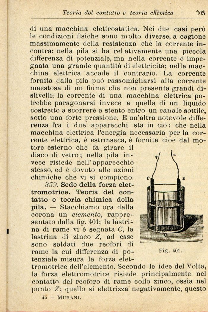 359. Sede della forza elettromotrice. Teoria del contatto e teoria chimica della pila. — Stacchiamo ora dalla corona un elemento, rappresentato dalla fig. 401; la lastrina di rame vi è segnata C, la lastrina di zinco Z, ad esse sono saldati due reofori di rame la cui differenza di potenziale misura la forza elettromotrice dell'elemento. Secondo le idee del Volta, la forza elettromotrice risiede principalmente nel contatto del reoforo di rame collo zinco, ossia nel punto Z; quello si elettrizza negativamente, questo 45 — Murani.