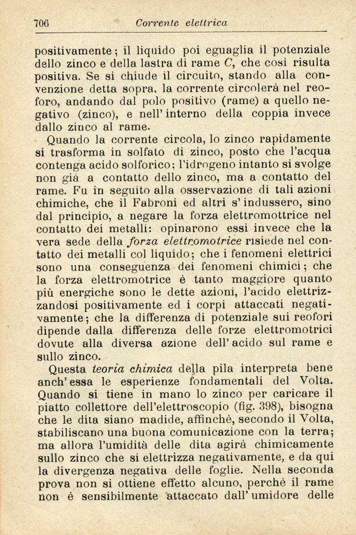 Quando la corrente circola, lo zinco rapidamente si trasforma in solfato di zinco, posto che l'acqua contenga acido solforico; l'idrogeno intanto si svolge non già a contatto dello zinco, ma a contatto del rame. Fu in seguito alla osservazione di tali azioni chimiche, che il Fabroni ed altri s'indussero, sino dal principio, a negare la forza elettromottrice nel contatto dei metalli: opinarono essi invece che la vera sede della forza elettromotrice risiede nel contatto dei metalli col liquido; che i fenomeni elettrici sono una conseguenza dei fenomeni chimici ; che la forza elettromotrice è tanto maggiore quanto più energiche sono le dette azioni, l'acido elettrizzandosi positivamente ed i corpi attaccati negativamente; che la differenza di potenziale sui reofori dipende dalla differenza delle forze elettromotrici dovute alla diversa azione dell' acido sul rame e sullo zinco.