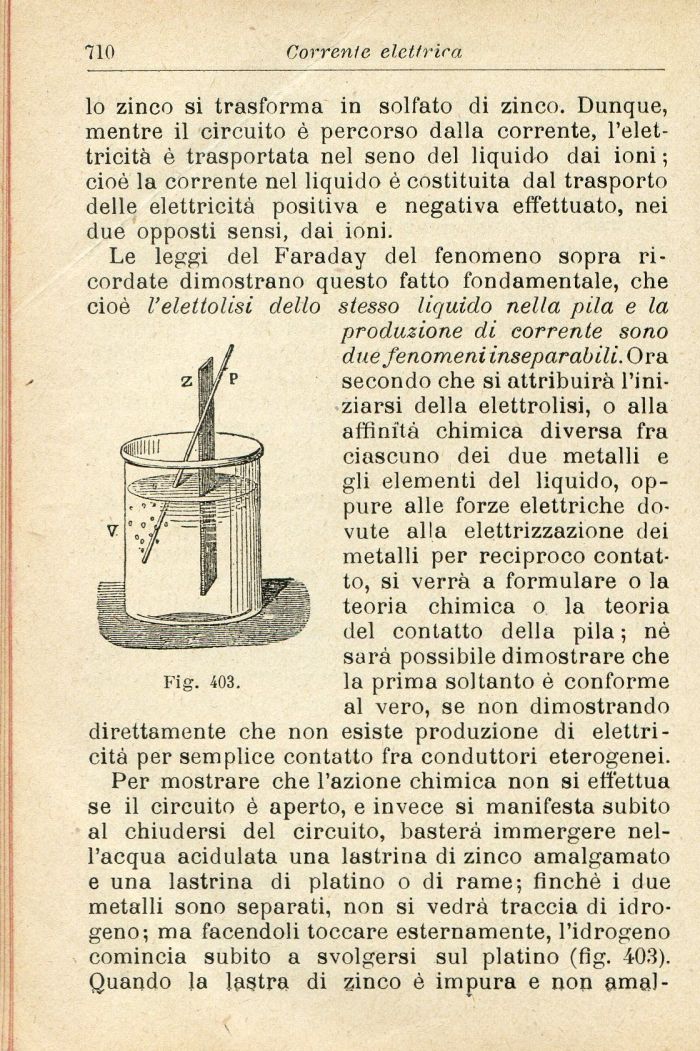 Per mostrare che l'azione chimica non si effettua se il circuito è aperto, e invece si manifesta subito al chiudersi del circuito, basterà immergere nell'acqua acidulata una lastrina di zinco amalgamato e una lastrina di platino o di rame; finché i due metalli sono separati, non si vedrà traccia di idrogeno; ma facendoli toccare esternamente, l'idrogeno comincia subito a svolgersi sul platino (fìg. 403). Quando la lastra di zinco è impura e non amal-
