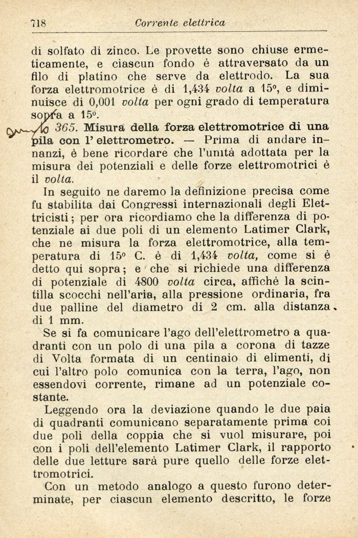In seguito ne daremo la definizione precisa come fu stabilita dai Congressi internazionali degli Elettricisti ; per ora ricordiamo che la differenza di potenziale ai due poli di un elemento Latimer Clark, che ne misura la forza elettromotrice, alla temperatura di 15° C. è di 1,434 volta, come si è detto qui sopra; e che si richiede una differenza di potenziale di 4800 volta circa, affichè la scintilla scocchi nell'aria, alla pressione ordinaria, fra due palline del diametro di 2 cm. alla distanza , di 1 mm.