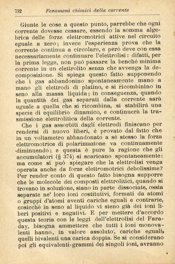 Che i gas assorbiti dagli elettrodi finiscano per rendersi di nuovo liberi, è provato dal fatto che in un voltametro abbandonato a sé stesso la forza elettromotrice di polarizzazione va continuamente ^diminuendo ; e questa è pure la ragione che gli accumulatori (§ 374) si scaricano spontaneamente: ma come si può spiegare che la elettrolisi venga operata anche da forze elettromotrici debolissime? Per render conto di questo fatto bisogna supporre che le molecole dei composti elettrolitici, quando si trovano in soluzione, siano in parte dissociate, ossia separate ne' loro ioni costitutivi, formati da atomi o gruppi d'atomi aventi cariche eguali e contrarie, cosicché in seno al liquido vi sieno già dei ioni liberi positivi e negativi. E per mettere d'accordo questa teoria con le leggi dell'elettrolisi del Faraday, bisogna ammettere che tutti i ioni monovalenti hanno, in valore assoluto, cariche eguali» quelli bivalenti una carica doppia. Se si considerano poi gli equivalenti-grammi dei singoli ioni, avranno