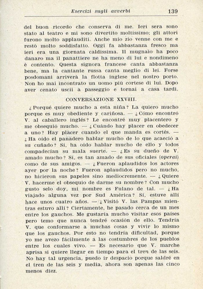 CONVERSAZIONE XXVIIT. i Porqué quiere mucho a està nifia? La quiero mucho porque es muy obediente y carinosa. — i Como encontró V. al caballero inglés? Le encontré muy placentero y me obsequió mucho. — j Cuàndo hay piacer en obedecer a uno ? Hay piacer cuando el que manda es cortes. — i Ha oido el panadero hablar mucho de lo que acaeció a su cunado? Si, ha òido hablar mucho de elio y todos compadecian su mala suerte. — iEs su dueno de V. amado mucho ? Si, es tan amado de sus oficiales (operai) corno de sus amigos. — i Fueron aplaudidos los actores ayer por la noche? Fueron aplaudidos pero no mucho, no hicieron sus papeles sino mediocremente. — i Quiere V. hacerme el obsequio de darme su nombre ? Con mucho gusto selo doy, mi nombre es Fulano de tal. — £ Ha viajado alguna vez por Sud América? Si, estuve alli hace unos cuatro anos. — i Visitò V. las Pampas mien-tras estuvo alli ? Ciertamente, he pasado cerca de un mes entre los gauchos. Me gustarla mucho visitar esos paises pero temo que nunca tendré ocasión de elio. Tendria V. que conformarse a muchas cosas y vivir lo mismo que los gauchos. Por esto no tendria dificultad, porque yo me avezo fàcilmente a las costumbres de los pueblos entre los cuales vivo. — Es necesario que V. marche aprisa si quiere llegar en tiempo para el tren de las seis. No hay tal urgencia, puedo ir despacio porque saldré en el tren de las seis y media, ahora son apenas las cinco menos diez.