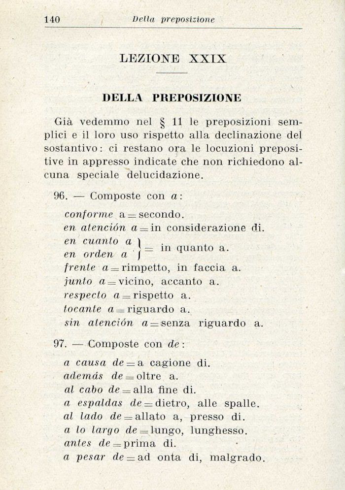 Giŕ vedemmo nel § 11 le preposizioni semplici e il loro uso rispetto alla declinazione del sostantivo : ci restano ora le locuzioni prepositive in appresso indicate che non richiedono alcuna speciale delucidazione.