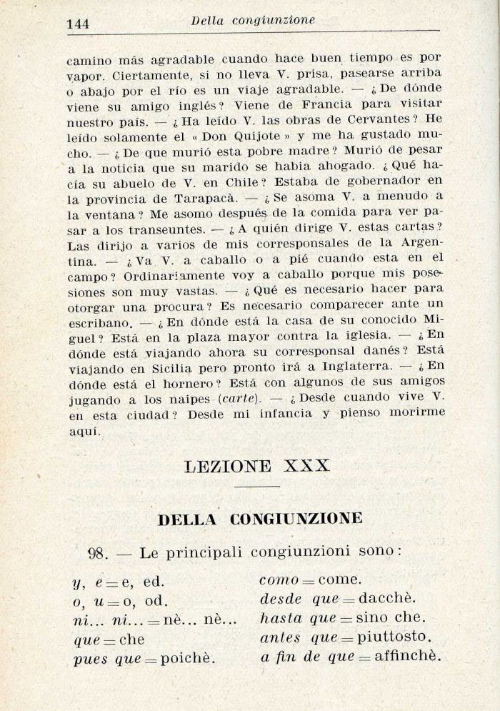 camino màs agradable cuando hace buen tiempo es poi-vapor. Ciertamente, si no lleva V. prisa, pasearse arriba o abajo por el rio es un viaje agradable. — i De dónde viene su amigo inglés? Viene de Francia para visitar nuestro pais. — i Ha leido V. las obras de Cervantes? He leido solamente el « Don Quijote » y me ha gustado mucho. — i De que murió està pobre madre ? Murió de pesar a la noticia que su marido se habia ahogado. i Qué ha-cia su abuelo de V. en Civile? Estaba de gobernador en la provincia de Tarapacà. — i Se asoma V. a menudo a la ventana ? Me asomo después de la comida para ver pa-sar a los transeuntes. — i A quién dirige V. estas cartas? Las dirijo a varios de mis corresponsales de la Argentina. — i Va V. a caballo o a pié cuando està en el campo? Ordinariamente voy a caballo porque mis pose-siones son muy vastas. — i Qué es necesario hacer para otorgar una procura? Es necesario comparecer ante un escribano. — i En dónde està la casa de su conocido Miguel? Està en la plaza mayor contra la iglesia. — « En dónde està viajando ahora su corresponsal danés? Està viajando en Sicilia pero pronto irà a lnglaterra. — i En dónde està el hornero ? Està con algunos de sus amigos jugando a los naipes (carte). — t Desde cuando vive V. en està ciudad ? Desde mi infancia y pienso morirme aqui.