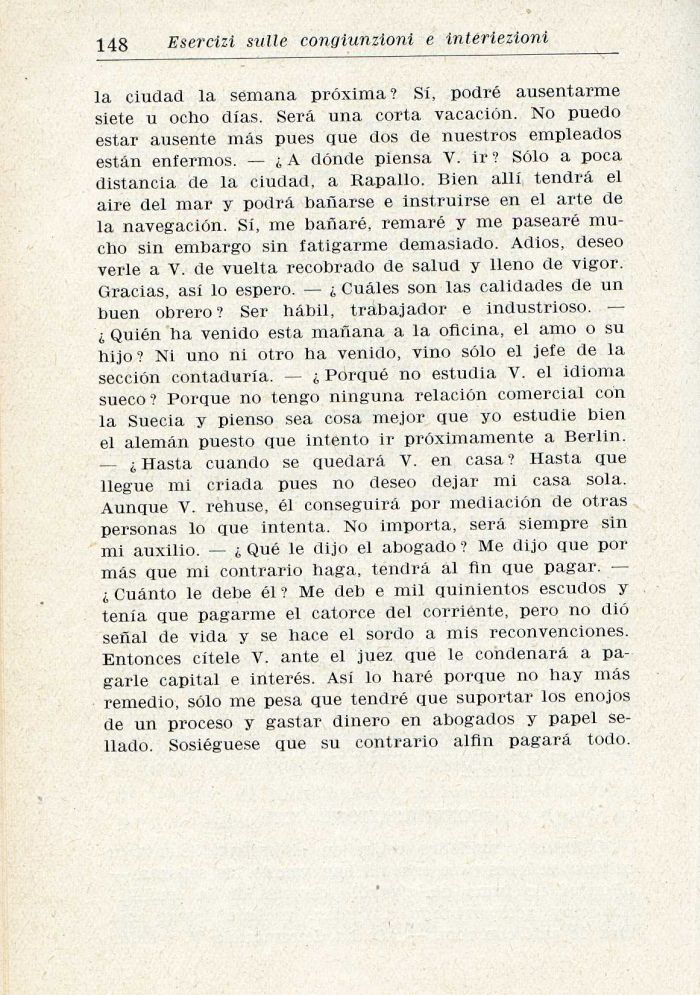 la ciuciaci la semana próxima? Si, podré ausentarme siete u ocho dias. Sera una corta vaeación. No puedo estar ausente màs pues que dos de nuestros empleados estàn entermos. — ;A dónde piensa V. ir ? Sólo a poca distancia de la ciudad, a Rapallo. Bien ali! tendrà el aire del mar y podrà banarse e instruirse en el arte de la navegación. Si, me banaré, remaré y me pasearé mucho sin embargo sin fatigarme demasiado. Adios, deseo verle a V. de vuelta recobrado de salud y lleno de vigor. Gracias, asi lo espero. — i Cuàles son las calidades de un buen obrero? Ser hàbil. trabajador e industrioso. — i Quién ha venido està mariana a la oficina, el amo o su hijo ? Ni uno ni otro ha venido, vino sólo el jefe de la sección contaduria. — i Porqué no estudia V. el idioma sueco ? Porque no tengo ninguna relación comercial con la Suecia y pienso sea cosa mejor que yo estudie bien el alemàn puesto que intento ir próximamente a Berlin. — i Hasta cuando se quedarà V. en casa ? Hasta que llegue mi criada pues no deseo dejar mi casa sola. Aunque V. rehuse, él conseguirà por mediación de otras personas lo que intenta. No importa, serà siempre sin mi auxilio. — i Qué le (lijo el abogado ? Me dijo que por màs que mi contrario liaga, tendrà al fin que pagar. — l Cuànto le debe él ? Me deb e mil quinientos escudos y tenia que pagarme el catorce del corriente, pero no dio senal de Vida y se hace el sordo a mis reconvenciones. Entonces citele Y. ante el juez que le condenarà a pagarle capital e interés. Asi lo haré porque no hay màs remedio, sólo me pesa que tendré que suportar los enojos de un proceso y gastar dinero en abogados y papel se-llado. Sosiéguese que su contrario altin pagarà todo.