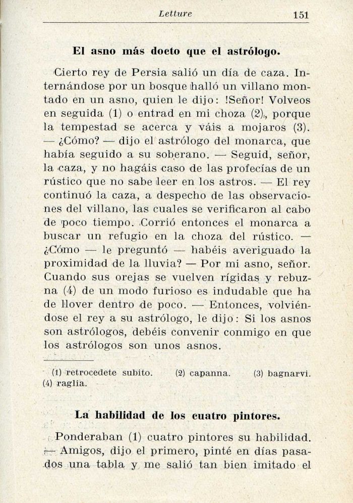 Gierto rey de Persia salió un dia de caza. Internandole por un bosque hallo un villano mon-tado en un asno, quien le dijo: ISenor! Volveos en seguida (1) o entrad en mi choza (2),, porque la tempestad se acerca y vàis a mojaros (3). — iCòmo? — dijo el astròlogo del monarca, que habia seguido a su soberano. — Seguid, senor, la caza, y no hagàis caso de las profecias de un rùstico que no sabe ileer en los astros. — El rey continuò la caza, a despecho de las observacio-nes del villano, las cuales se verifìcaron al cabo de poco tiempo. Corrió entonces el monarca a buscar un refugio en la choza del rùstico. — i'Cómo — le preguntó — habéis averiguado la proximidad de la lluvia? — Por mi asno, senor. Cuando sus orejas se vuelven rlgidas y rebuz-na (4) de un modo furioso es indudable que ha de Hover dentro de poco. — Entonces, volvién-dose el rey a su astròlogo, le dijo: Si los asnos son astròlogos, debéis convenir conmigo en que los astròlogos son unos asnos.
