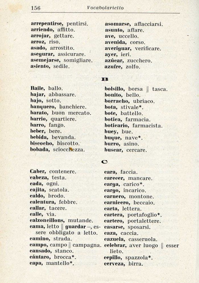 cara, faccia, carecer, mancare, carga, carico*, cargo, incarico, carnero, montone, carnicero, beccaio, carta, lettera, carlera, portafoglio*, cartero, portalettere, casarsc, sposarsi, caza, caccia, cazucla, casseruola. . celebrar, aver luogo ,, esser lieto, (•(¦pillo, spazzola*, cerveza, birra.