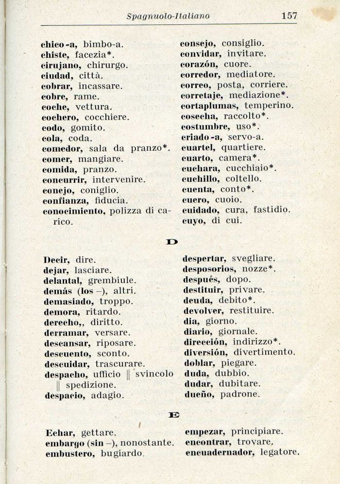 chico-a, bimbo-a. cliisle, facezia*, ciriijano, chirurgo, ciiidad, città, cobrar, incassare, cobre, rame, coche, vettura, cochero, cocchiere, collo, gomito, cola, coda.