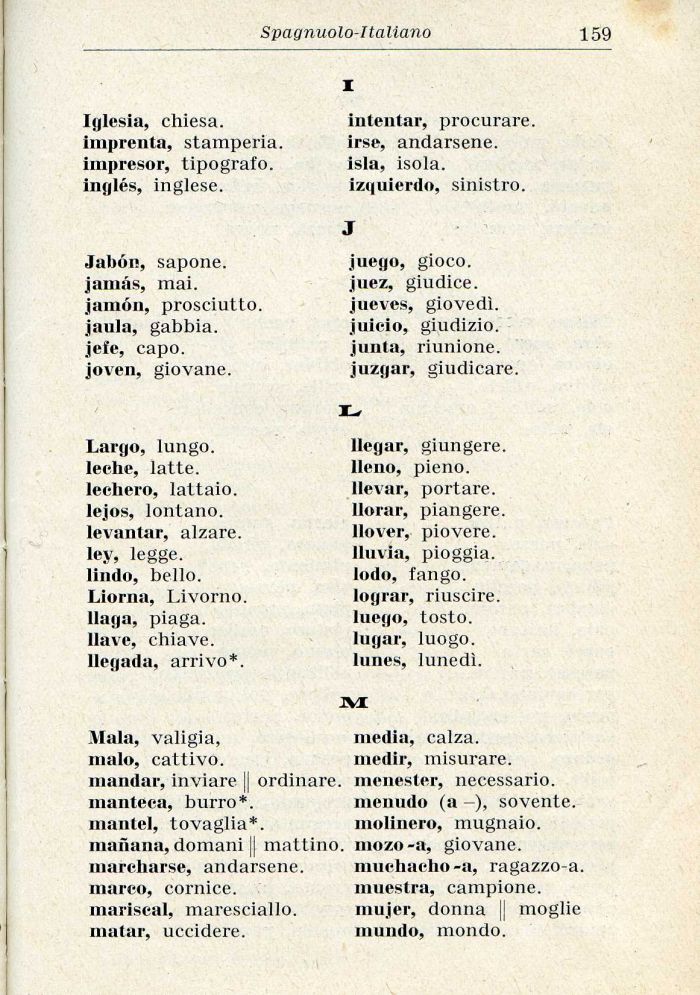 Largo, lungo, leche, latte, leehero, lattaio, lejos, lontano, levantar, alzare, lev, legge, lindo, bello. Liorna, Livorno, llaga, piaga, llave, chiave, llejiada, arrivo*.
