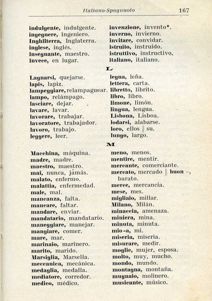 Macchina, māquina. madre, madre, maestro, maestro, mai, nunca, jamās. malato, enfermo. malattia, enfermedad. male, mal. mancanza, falta. mancare, faltar. mandare, enviar. mandatario, mandatario, maneggiare, manejar. mangiare, corner, mare, mar. marinaio, marinerō, marito, marido. Marsiglia, Marsella. meccanica, mecānica. medaglia, medalla. mediatore, corredor. medico, mčdico.