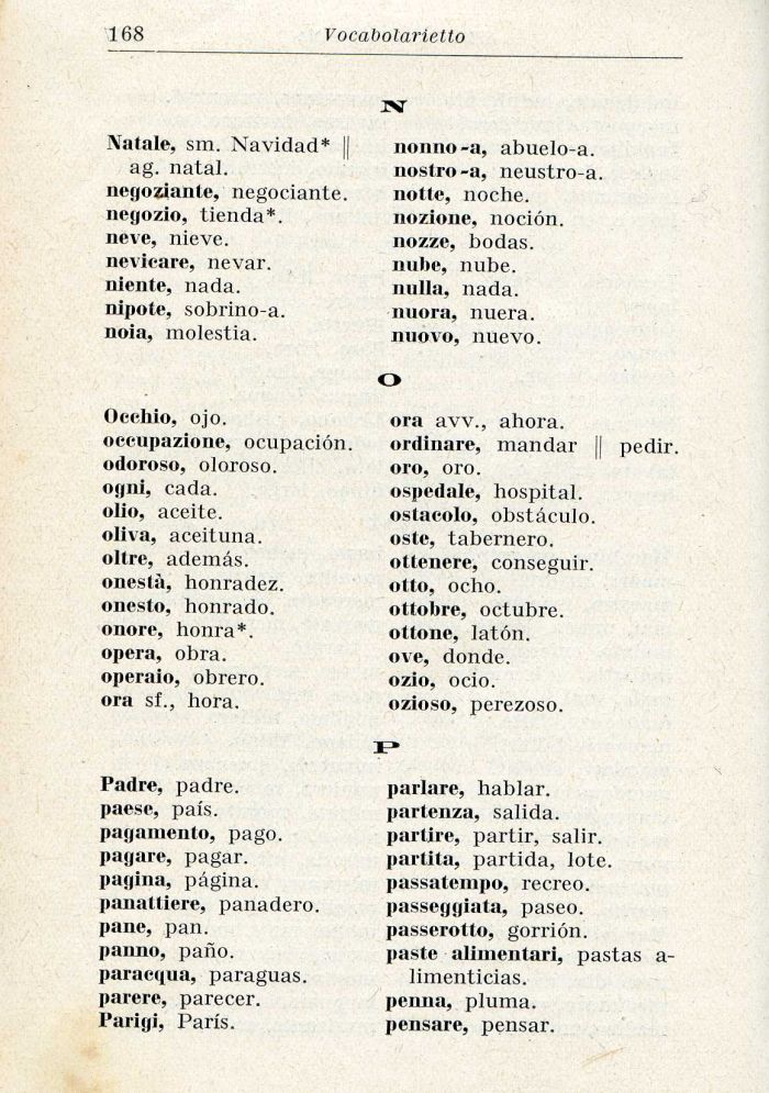 occupazione, ocupación. odoroso, oloroso. ogni, cada, olio, aceite. oliva, aceituna. oltre, ademàs. onestà, honradez. onesto, honrado. onore, honra*. opera, obra. operaio, obrero. ora st., hora.