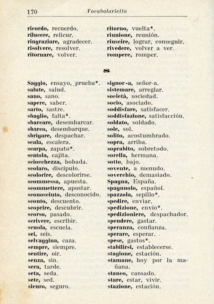 solito, acostumbrado. sopra, arriba. soprabito, sobretodo. sorella, hermana. sotto, bajo. sovente, a menudo. soverchio, demasiado. Spagna, Espana, spagnuoio, espanol. spazzola, sepillo*. spedire, enviar. spedizione, envlo*. spedizioniere, despachador. spendere, gastar. speranza, conflanza. sperare, esperar. . spese, gastos*. stabilirsi, establecerse. stagione, estación. stamane, hoy por la ma-
