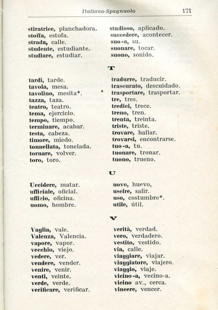 tradurre, traducir. trascurato, descuidado. * trasportare, trasportar, tre, tres. tredici, trece. treno, tren. trenta, treinta. triste, triste, trovare, hallar. trovarsi, encontrarse. tuo-a, tu. tuonare, tronar. tuono, trueno.