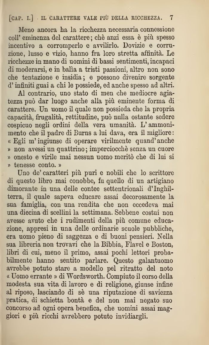 Al contrario, uno stato di men che mediocre agiatezza può dar luogo anche alla più eminente forma di carattere. Un uomo il quale non possieda che la propria capacità, frugalità, rettitudine, può nulla ostante sedere cospicuo negli ordini della vera umanità. L'ammonimento che il padre di Burns a lui dava, era il migliore : « Egli m'ingiunse di operare virilmente quand' anche » non avessi un quattrino ; imperciocché senza un cuore « onesto e virile mai nessun uomo meritò che di lui si » tenesse conto. »