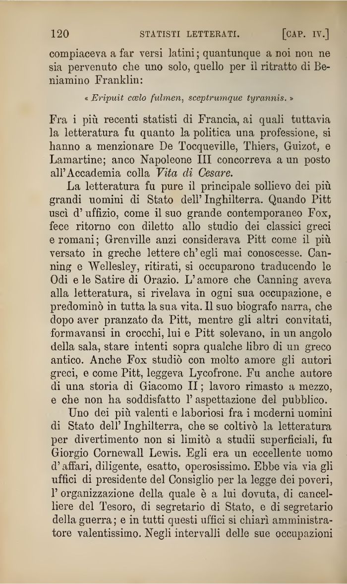 Uno dei più valenti e laboriosi fra i moderni uomini eli Stato deli' Inghilterra, che se coltivò la letteratura per divertimento non si limitò a studii superficiali, fu Giorgio Cornewall Lewis. Egli era un eccellente uomo d'affari, diligente, esatto, operosissimo. Ebbe via via gli uffici eli presidente del Consiglio per la legge dei poveri, 1' organizzazione della quale è a lui dovuta, di cancelliere del Tesoro, eli segretario di Stato, e eli segretario della guerra ; e in tutti questi uffici si chiarì amministratore valentissimo. Negli intervalli delle sue occupazioni