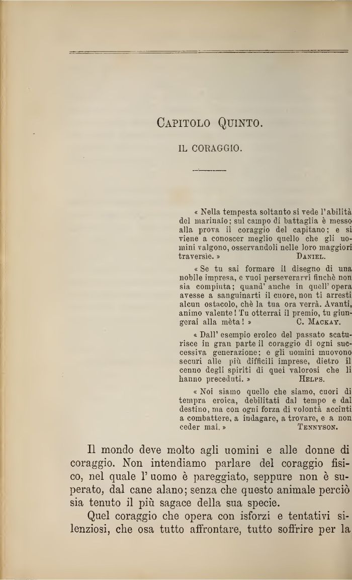 li mondo deve molto agli uomini e alle donne di coraggio. Non intendiamo parlare del coraggio fisico, nel quale 1' uomo è pareggiato, seppure non è superato, dal cane alano; senza che questo animale perciò sia tenuto il più sagace della sua specie.