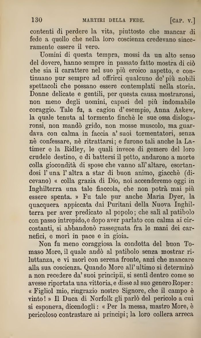 Non fu meno coraggiosa la condotta del buon Tomaso More, il quale andò al patibolo senza mostrar riluttanza. e vi morì con serena fronte, anzi che mancare alla sua coscienza. Quando More all' ultimo si determinò a non recedere da' suoi principi!, si sentì dentro come se avesse riportata una vittoria, e disse al suo genero Roper : « Figliol mio, ringrazio nostro Signore, che il campo è vinto ! » Il Duca di Norfolk gli parlò del pericolo a cui si esponeva, dicendogli : « Per la messa, mastro More, è pericoloso contrastare ai principi ; la loro collera arreca