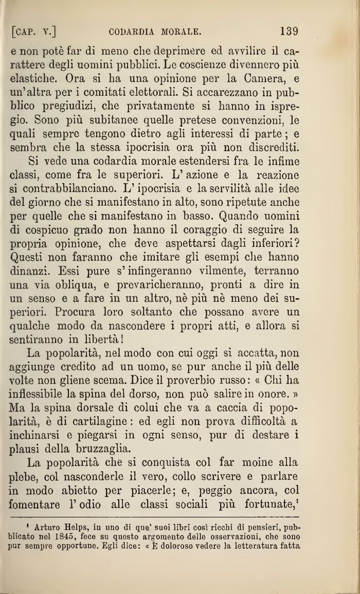 Si vede una codardia morale estendersi fra le infime classi, come fra le superiori. L' azione e la reazione si contrabbilanciano. L'ipocrisia e la servilità alle idee del giorno che si manifestano in alto, sono ripetute anche per quelle che si manifestano in basso. Quando uomini di cospicuo grado non hanno il coraggio di seguire la propria opinione, che deve aspettarsi dagli inferiori? Questi non faranno che imitare gli esempi che hanno dinanzi. Essi pure s'infingeranno vilmente, terranno una via obliqua, e prevaricheranno, pronti a dire in un senso e a fare in un altro, nè più nè meno dei superiori. Procura loro soltanto che possano avere un qualche modo da nascondere i propri atti, e allora si sentiranno in libertà!