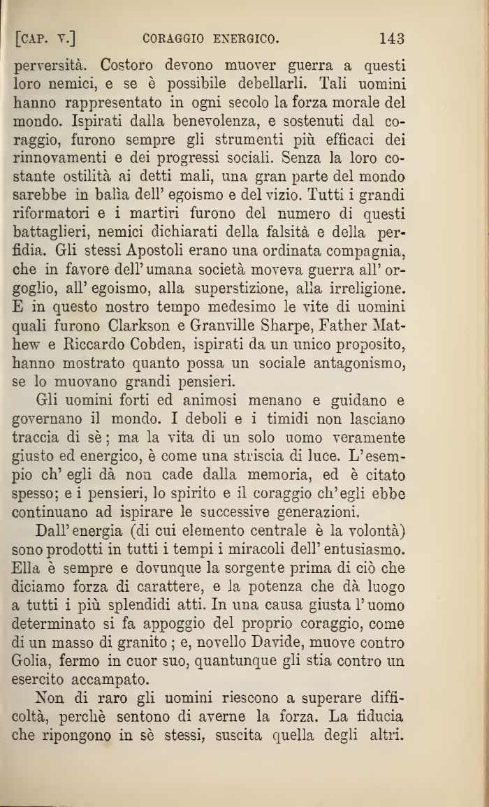 Dall' energia (di cui elemento centrale è la volontà) sono prodotti in tutti i tempi i miracoli dell' entusiasmo. Ella è sempre e dovunque la sorgente prima di ciò che diciamo forza di carattere, e la potenza che dà luogo a tutti i più splendidi atti In una causa giusta l'uomo determinato si fa appoggio del proprio coraggio, come di un masso di granito ; e, novello Davide, muove contro Golia, fermo in cuor suo, quantunque gli stia contro un esercito accampato.