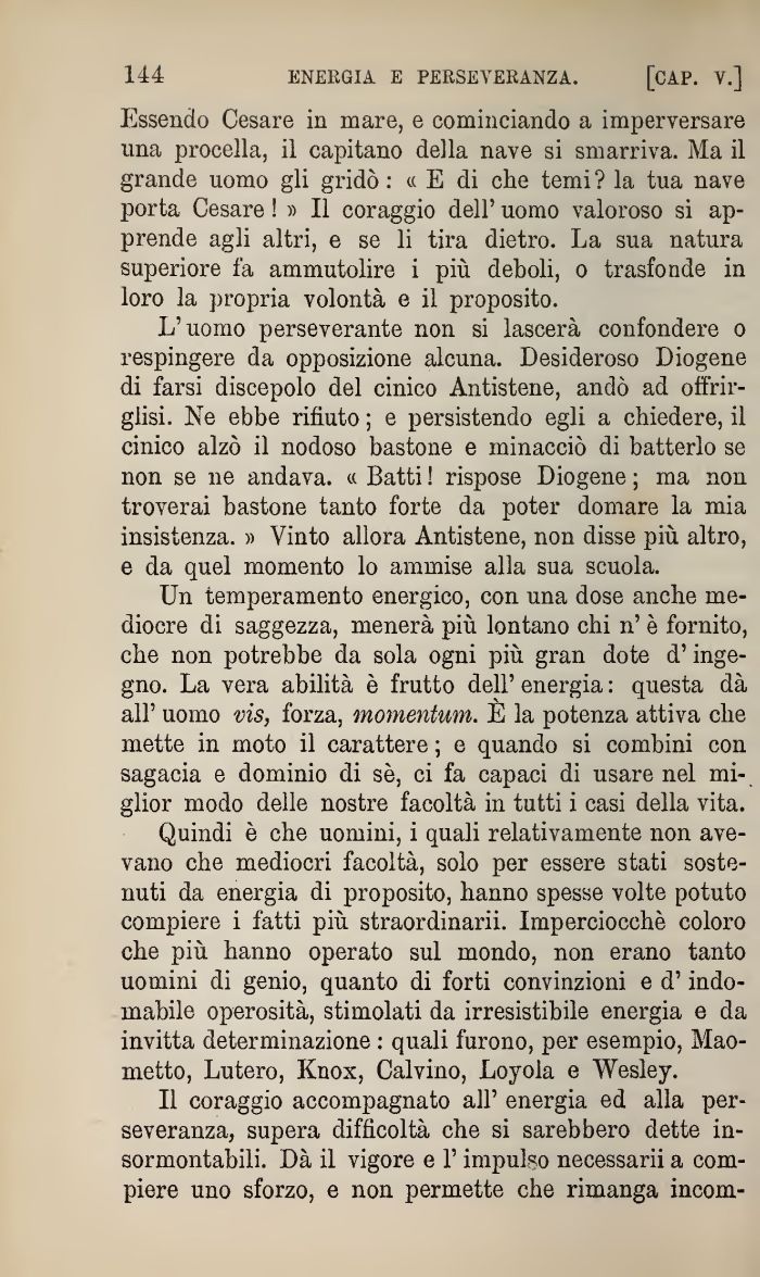 Quindi è che uomini, i quali relativamente non avevano che mediocri facoltà, solo per essere stati sostenuti da energia di proposito, hanno spesse volte potuto compiere i fatti più straordinarii. Imperciocché coloro che più hanno operato sul mondo, non erano tanto uomini di genio, quanto di forti convinzioni e d'indomabile operosità, stimolati da irresistibile energia e da invitta determinazione : quali furono, per esempio, Maometto, Lutero, Knos, Calvino, Loyoia e Wesley.
