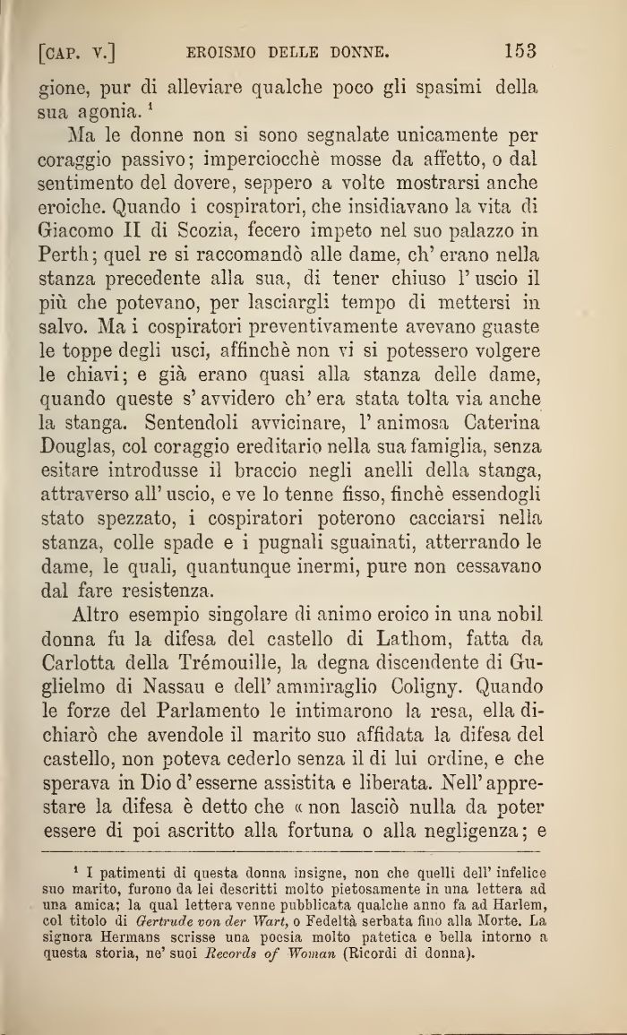 Ma le donne non si sono segnalate unicamente per coraggio passivo ; imperciocché mosse da affetto, o dal sentimento del dovere, seppero a volte mostrarsi anche eroiche. Quando i cospiratori, che insidiavano la vita di Giacomo II di Scozia, fecero impeto nel suo palazzo in Perth ; quel re si raccomandò alle dame, eh' erano nella stanza precedente alla sua, di tener chiuso 1' uscio il più che potevano, per lasciargli tempo di mettersi in salvo. Ma i cospiratori preventivamente avevano guaste le toppe degli usci, affinchè non vi si potessero volgere le chiavi; e già erano quasi alla stanza delle dame, quando queste s'avvidero eh' era stata tolta via anche la stanga. Sentendoli avvicinare, l'animosa Caterina Douglas, col coraggio ereditario nella sua famiglia, senza esitare introdusse il braccio negli anelli della stanga, attraverso all' uscio, e ve lo tenne fisso, finché essendogli stato spezzato, i cospiratori poterono cacciarsi nella stanza, colie spade e i pugnali sguainati, atterrando le dame, le quali, quantunque inermi, pure non cessavano dal fare resistenza.