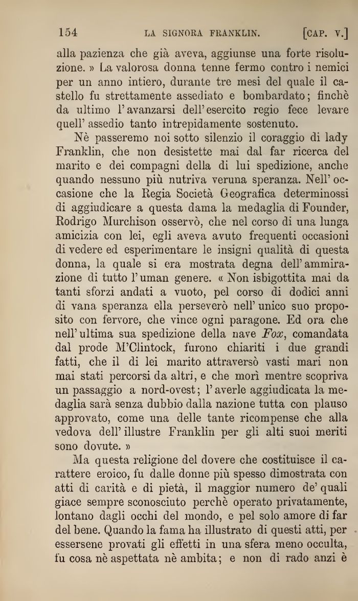 Nè passeremo noi sotto silenzio il coraggio di lady Franklin, che non desistette mai dal far ricerca del marito e dei compagni della di lui spedizione, anche quando nessuno più nutriva veruna speranza. Neil' occasione che la Regia Società Geografica determinossi di aggiudicare a questa dama la medaglia di Founder, Rodrigo Murchison osservò, che nel corso di una lunga amicizia con lei, egli aveva avuto frequenti occasioni di vedere ed esperimentare le insigni qualità di questa donna, la quale si era mostrata degna dell'ammirazione di tutto Fumali genere. « Non isbigottita mai da tanti sfòrzi andati a vuoto, pel corso di dodici anni di vana speranza ella perseverò nell' unico suo proposito con fervore, che vince ogni paragone. Ed ora che nell'ultima sua spedizione della nave Fox, comandata dal prode M'Clintock, furono chiariti i due grandi fatti, che il di lei marito attraversò vasti .mari non mai stati percorsi da altri, e che morì mentre scopriva un passaggio a nord-ovest ; F averle aggiudicata la medaglia sarà senza dubbio dalla nazione tutta con plauso approvato, come una delle tante ricompense che alla vedova dell' illustre Franklin per gli alti suoi meriti sono dovute. »
