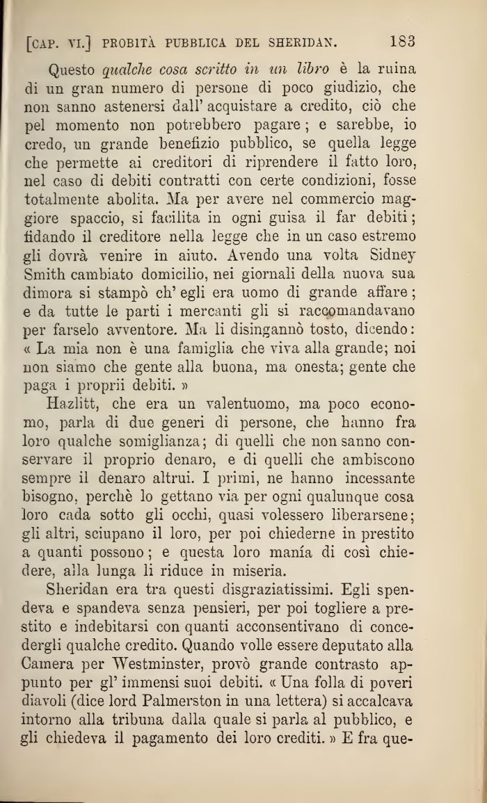 Questo gualche cosa scritto in un libro è la mina di un gran numero di persone di poco giudizio, che non sanno astenersi dall' acquistare a credito, ciò che pel momento non potrebbero pagare ; e sarebbe, io credo, un grande benefizio pubblico, se quella legge che permette ai creditori di riprendere il fatto loro, nel caso di debiti contratti con certe condizioni, fosse totalmente abolita. Ma per avere nel commercio maggiore spaccio, si facilita in ogni guisa il far debiti ; fidando il creditore nella legge che in un caso estremo gli dovrà venire in aiuto. Avendo una volta Sidney Smith cambiato domicilio, nei giornali della nuova sua dimora si stampò eh' egli era uomo di grande affare ; e da tutte le parti i mercanti gli si raccomandavano per farselo avventore. Ma li disingannò tosto, dicendo : « La mia non è una famiglia che viva alla grande; noi non siamo che gente alla buona, ma onesta; gente che paga i proprii debiti. »