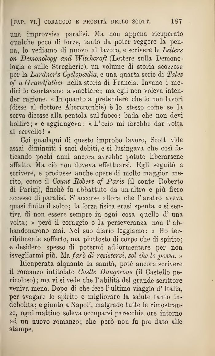 una improvvisa paralisi. Ma non appena ricuperato qualche poco di forze, tanto da poter reggere la penna, lo vediamo di nuovo al lavoro, e scrivere le Letters on Demonology and Witchcraft (Lettere sulla Demonologia e sulle Stregherie), un volume di storia scozzese per la Lardner's Wyclopmdia, e una quarta serie di Tales of a Grandfather nella storia di Francia. Invano i medici lo esortavano a smettere : ma egli non voleva intender ragione. « In quanto a pretendere che io non lavori (disse al dottore Abercrombie) è lo stesso come se la serva dicesse alla pentola sul fuoco : bada che non devi bollire ; » e aggiungeva : «. L'ozio mi farebbe dar volta al cervello ! »