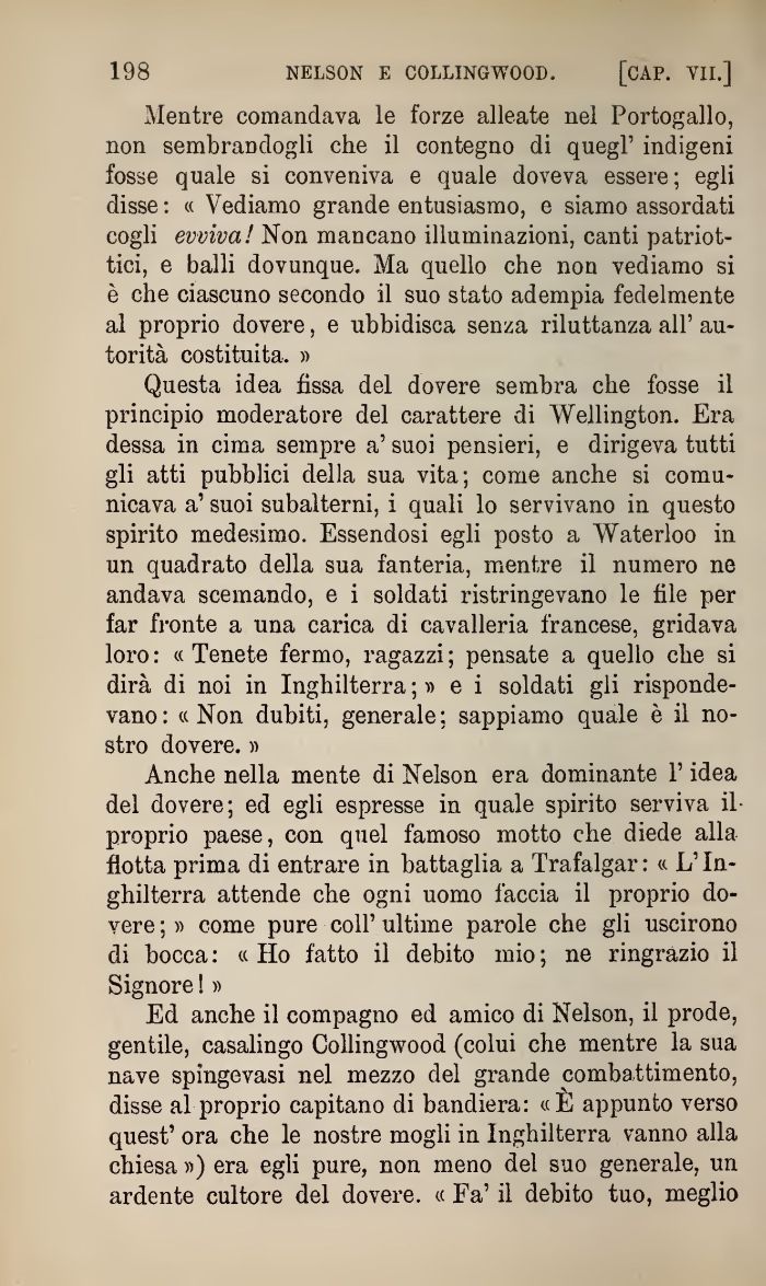Ed anche il compagno ed amico di Nelson, il prode, gentile, casalingo Gollingwood (colui che mentre la sua nave spingevasi nel mezzo del grande combattimento, disse al proprio capitano di bandiera: «Č appunto verso quest' ora che le nostre mogli in Inghilterra vanno alla chiesa ») era egli pure, non meno del suo generale, un ardente cultore del dovere. « Fa' il debito tuo, meglio