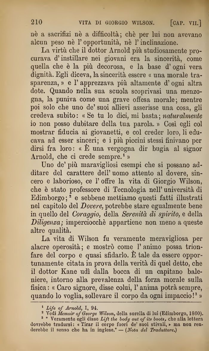 Uno de' più maravigli® esempi che si possano additare del carattere dell' uomo attento al dovere, sincero e laborioso, ce 1' offre la vita di Giorgio Wilson, che è stato professore di Tecnologia nelP università di Edimborgo ;2 e sebbene mettiamo questi fatti illustrati nel capitolo del Dovere, potrebbe stare egualmente bene in quello del Coraggio, della Serenità di spirito, e della Diligenza; imperciocché appartiene non meno a queste altre qualità.