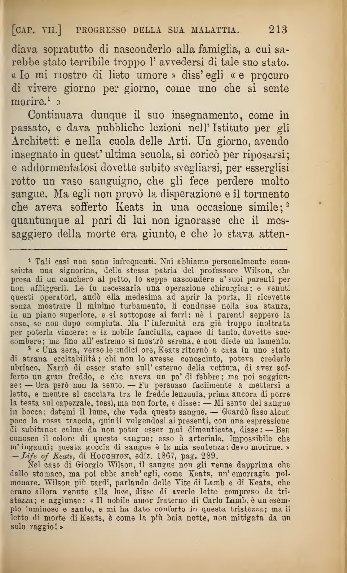 Nel caso di Giorgio Wilson, il sangue non gli venne dapprima che dallo stomaco, ma poi ebbe anch' egli, come Keats, un' emorragia polmonare. Wilson più tardi, parlando delle Vite di Lamb e di Keats, che erano allora venute alla luce, disse di averle lette compreso da tristezza; e aggiunse: «Il nobile amor fraterno di Carlo Lamb, è un esempio luminoso e santo, e mi ha dato conforto in questa tristezza; ma il letto di morte di Keats, è come la più buia notte, non mitigata da un solo raggio! »