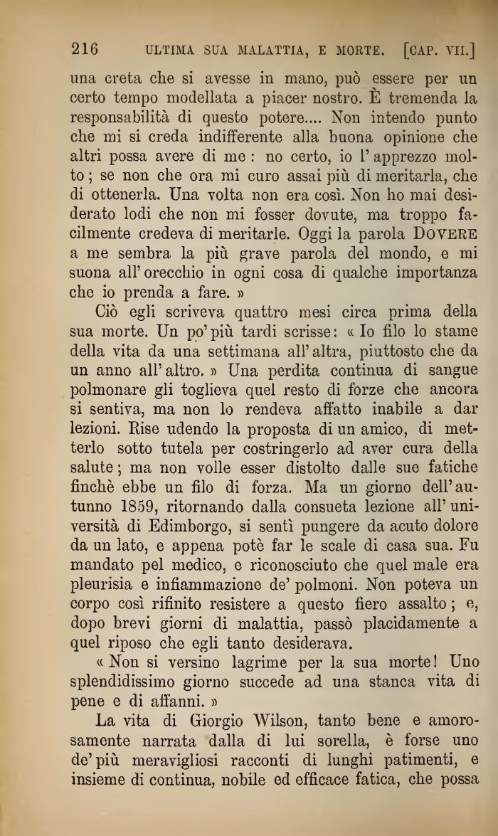 Ciò egli scriveva quattro mesi circa prima della sua morte. Un po' più tardi scrisse : « Io filo lo stame della vita da una settimana all' altra, piuttosto che da un anno all' altro. » Una perdita continua di sangue polmonare gli toglieva quel resto di forze che ancora si sentiva, ma non lo rendeva affatto inabile a dar lezioni. Rise udendo la proposta di un amico, di metterlo sotto tutela per costringerlo ad aver cura della salute ; ma non volle esser distolto dalle sue fatiche finché ebbe un filo di forza. Ma un giorno dell'autunno 1859, ritornando dalla consueta lezione all' università di Edimborgo, si sentì pungere da acuto dolore da un lato, e appena potè far le scale di casa sua. Fu mandato pel medico, e riconosciuto che quel male era pleurisia e infiammazione de' polmoni. Non poteva un corpo così rifinito resistere a questo fiero assalto ; e, dopo brevi giorni di malattia, passò placidamente a quel riposo che egli tanto desiderava.