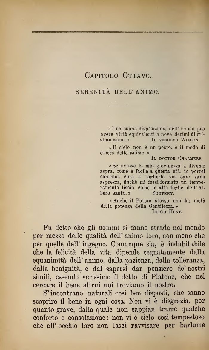 Fu detto che gli uomini si fanno strada nel mondo per mezzo delle qualità dell' animo loro, non meno che per quelle dell' ingegno. Comunque sia, è indubitabile che la felicità della vita dipende segnatamente dalla equanimità dell' animo, dalla pazienza, dalla tolleranza, dalla benignità, e dal sapersi dar pensiero de' nostri simili, essendo verissimo il detto di Platone, che nel cercare il bene altrui noi troviamo il nostro.