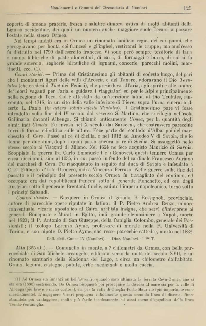 Uomini illustri. — Nacquero in Ormea il gesuita B. Rossignoli, provinciale, autore di parecchie opere riputate in latino ; il P. Pietro Andrea Benzo, minore conventuale, vicario apostolico al Cairo, arabista insigne, che servì d'interprete ai generali Bonaparte e Marat in Egitto, indi grande elemosiniere a Napoli, morto nel 1820; il P. Antonio di San Giuseppe, della famiglia Colombo, generale dei Passionisi! ; il teologo Lorenzo Ayme, professore di morale nella R. Università di Torino, e suo nipote D. Pietro Ayme, che resse parecchie cattedre, morto nel 1832.