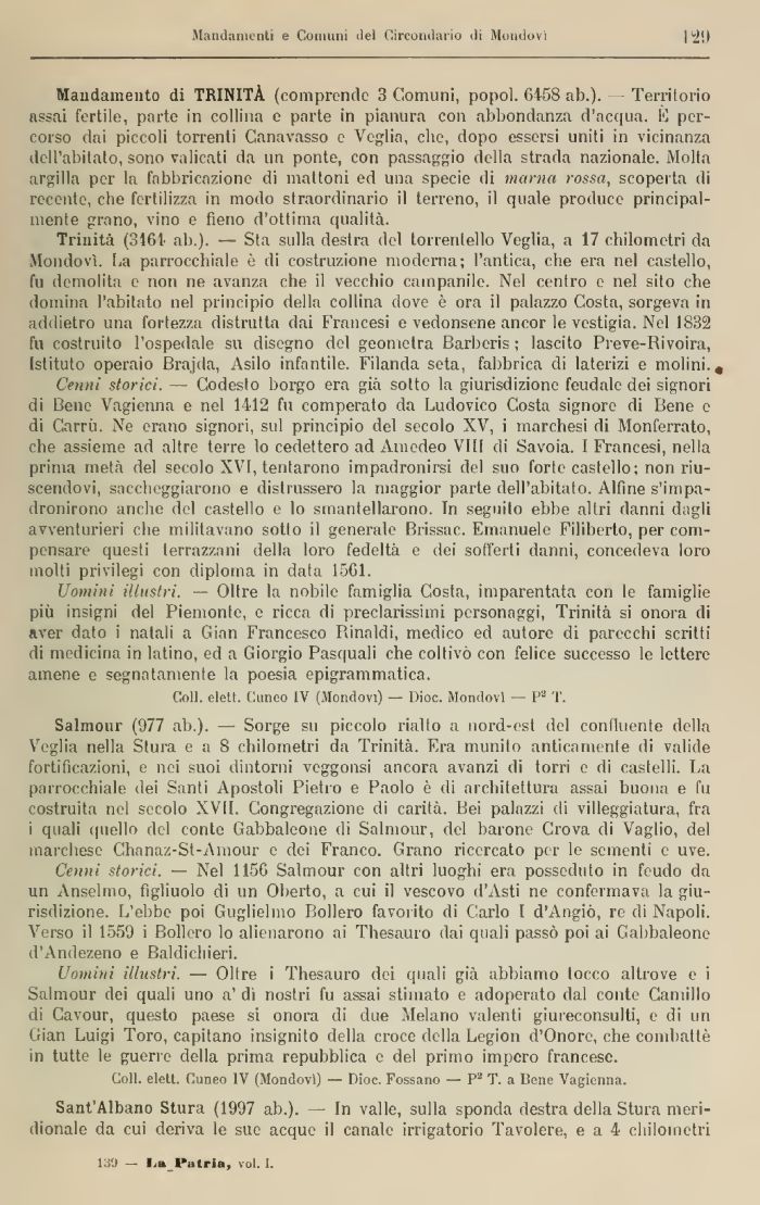 Trinità (3161 ab.). — Sta sulla destra del torrentello Veglia, a 17 chilometri da Mondovì. La parrocchiale è di costruzione moderna; l'antica, che era nel castello, fu demolita e non ne avanza che il vecchio campanile. Nel centro e nel sito che domina l'abitato nel principio della collina dove è ora il palazzo Costa, sorgeva in addietro una fortezza distrutta dai Francesi e vedonsene ancor le vestigia. Nel 1832 fu costruito l'ospedale su disegno del geometra Barberis ; lascito Preve-Rivoira, Istituto operaio Brajda, Asilo infantile. Filanda seta, fabbrica di laterizi e ruolini. «